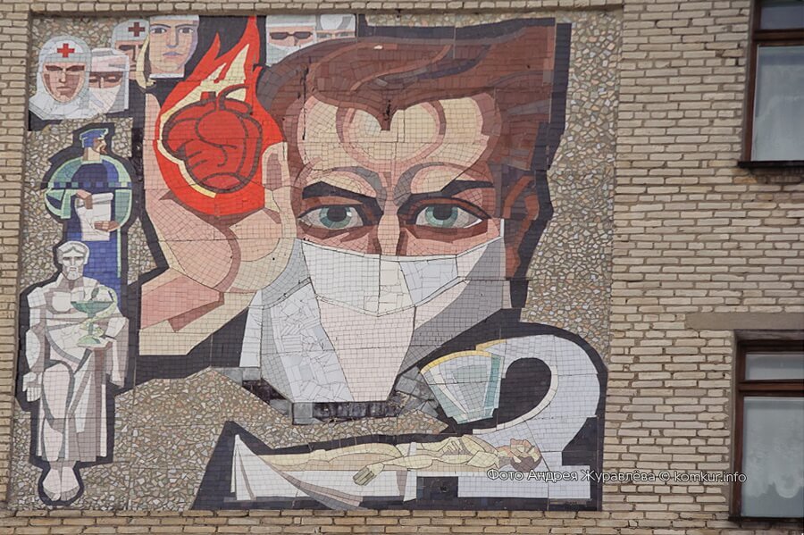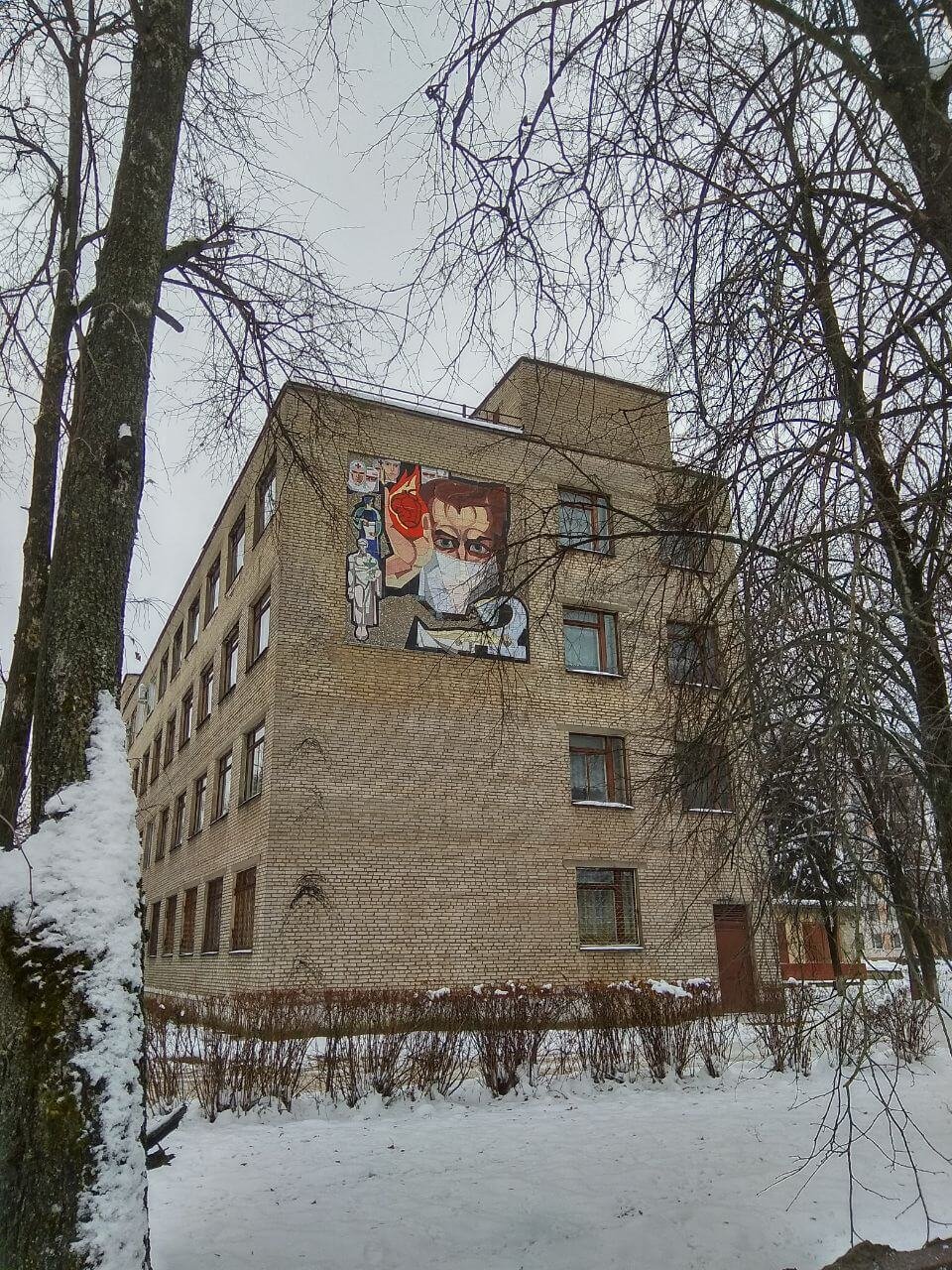 Першая мазаіка Сямёна Абрамава размяшчаецца на старым корпусе лякарні імя Марзона (у планах яго знесці ў хуткім часе, што выклікае пытанні – ці будзе захаваная мазаіка).